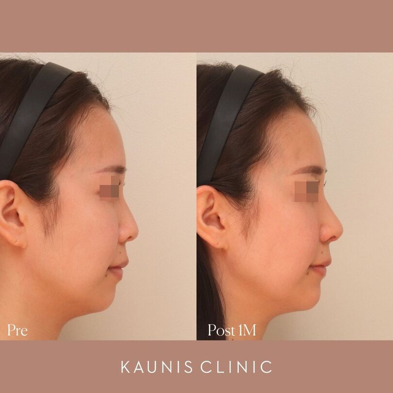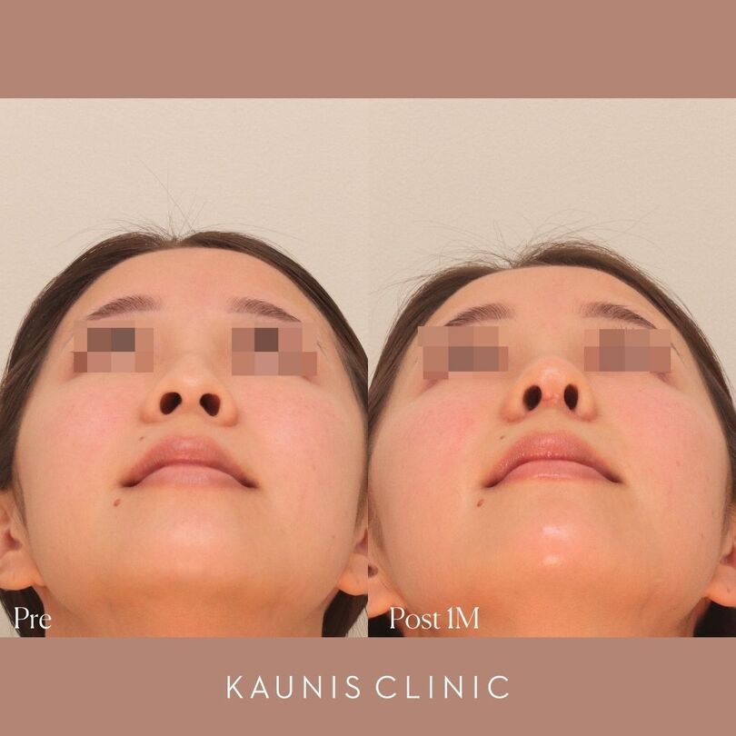 自然にEラインを整える【鼻中隔延長、鼻柱下降術、鼻翼縮小術(内側法)、鼻翼基部増大術(粉砕肋軟骨)、顎ヒアルロン酸注入 手術後1か月、2週間、1週間】