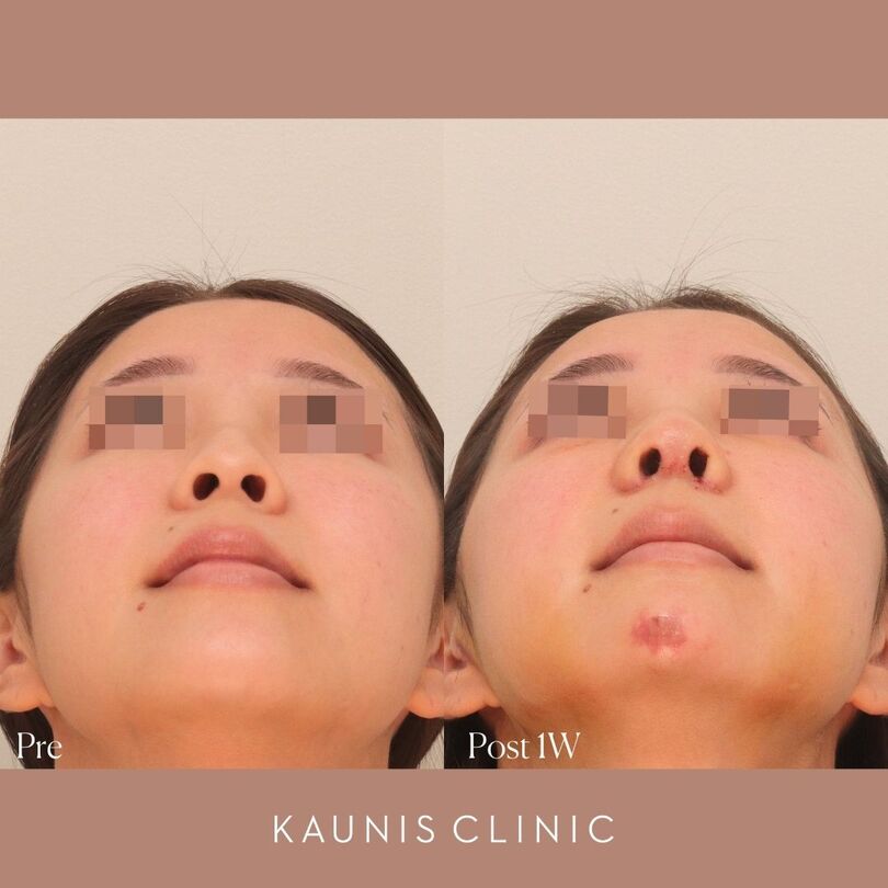 鼻中隔延長、隆鼻(オーダーメイドプロテーゼ) 、鼻柱下降術、鼻尖縮小、鼻翼縮小術(内側法)、鼻翼基部増大術(粉砕肋軟骨)、顎ヒアルロン酸注入 手術後1か月、2週間、1週間
