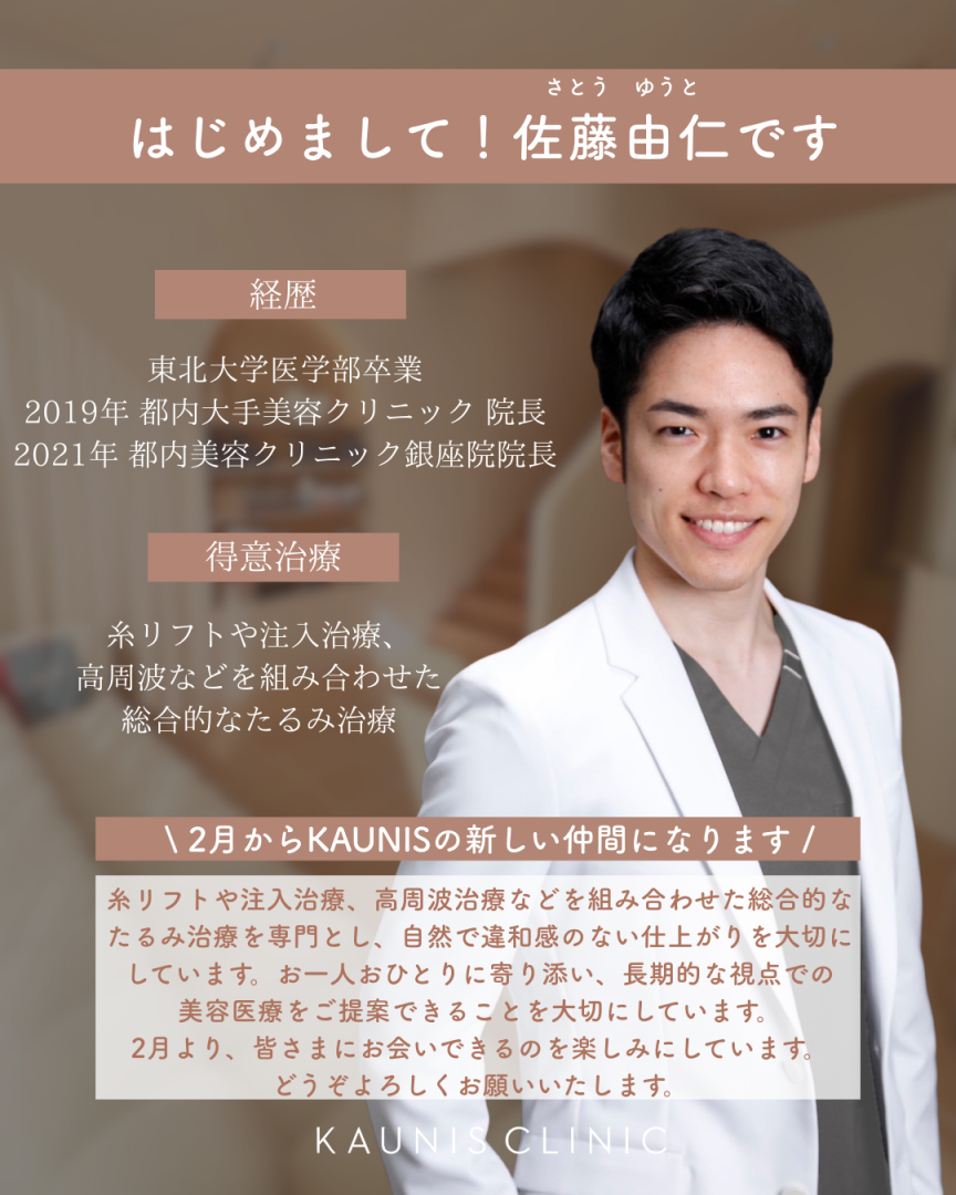 この度、KAUNISに新ドクター・佐藤由仁(さとうゆうじ)先生が2月2日(月)より入職いたします。